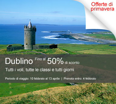 Prenotando entro domani 4 febbraio, verranno applicati sconti fino al 50% alla sola tariffa di volo, tasse e addebiti esclusi, per viaggiare tra il 10 febbraio e il 13 aprile 2011 dall’Italia verso Dublino, Cork e Belfast.