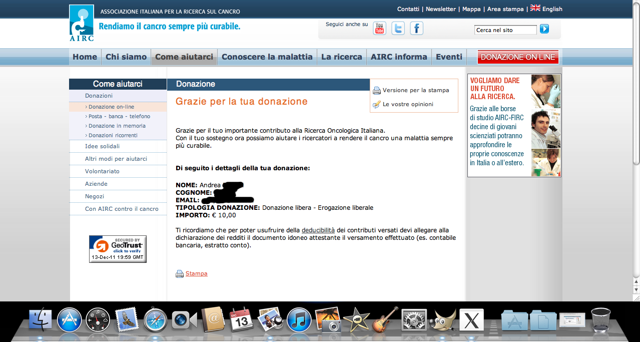 Donazione all'AIRC per il 2° Compleanno di VoloGratis