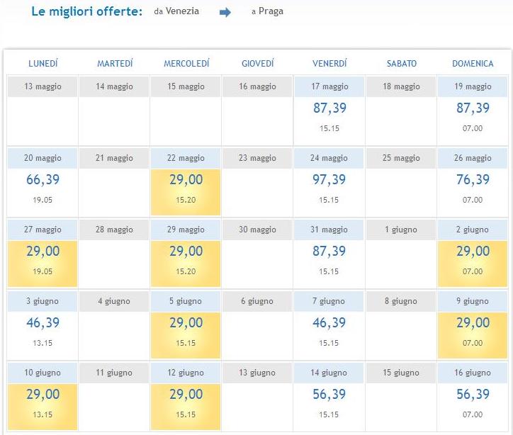 Devo dire che i voli a € 29 tutto compreso si trovano eccome, guardate ad esempio questi voli Venezia – Praga per il mese di giugno, ce ne sono anche per il mese di maggio.